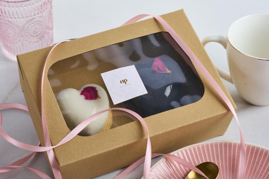 Dva jemné mousse dezerty v tvare srdca, zabalené v elegantnom darčekovom balení. Ideálny pre potešenie niekoho blízkeho alebo ako sladké poďakovanie.