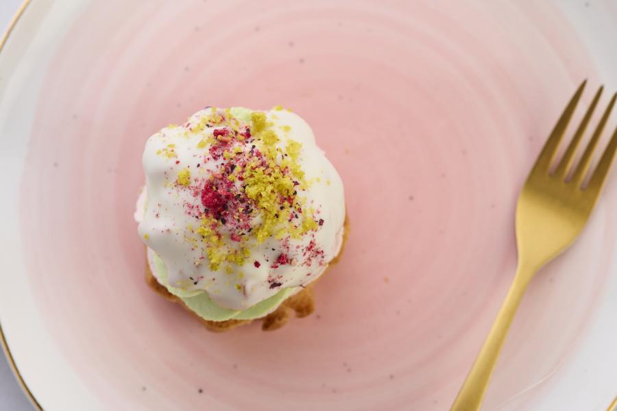 Jemný odpaľovaný veterník plnený lahodným malinovým džemom a dvoma vrstvami nadýchaného pistáciového šľahačkového krému. Medzi krémami sa ukrýva osviežujúca malinová vrstva, ktorá dezertu dodáva príjemnú ovocnú kyslosť. Povrch tvorí klobúčik z bielej a malinovej čokolády, posypaný lyofilizovanými malinami a chrumkavými pistáciami.